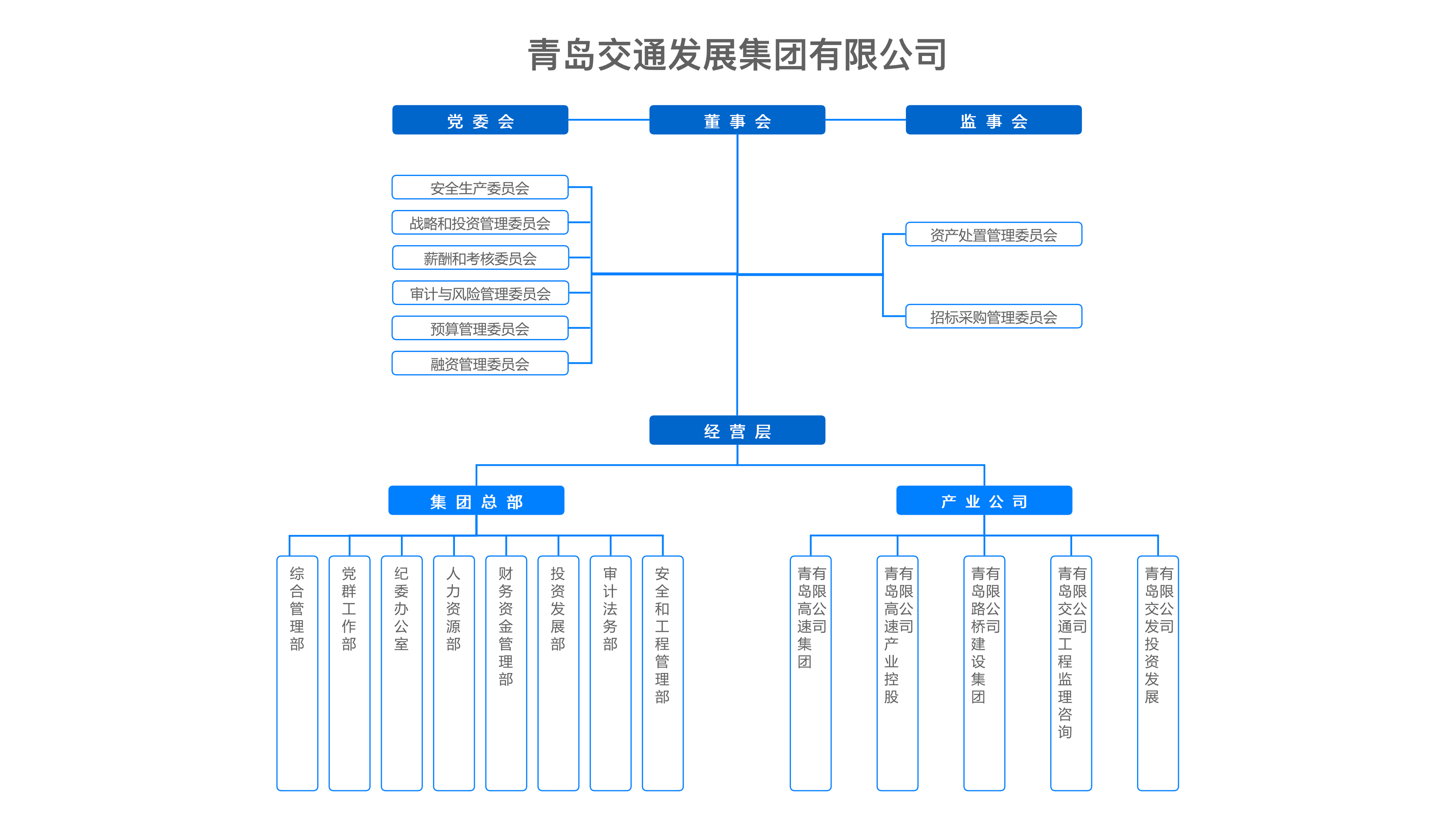 青島交通發(fā)展集團(tuán)有限公司(以下簡稱“交發(fā)集團(tuán)”)成立2012年5月,注冊資本10億元,定位為青島市交通建設(shè)投融資主體,負(fù)責(zé)所轄高速公路等交通基礎(chǔ)設(shè)施的運(yùn)營、養(yǎng)護(hù)、管理工作和投融資建設(shè)任務(wù),承擔(dān)青島市未來高速公路發(fā)展和交通基礎(chǔ)設(shè)施建設(shè)投融資等職能?,F(xiàn)有所屬二級企業(yè)18戶,干部職工2100余人。
